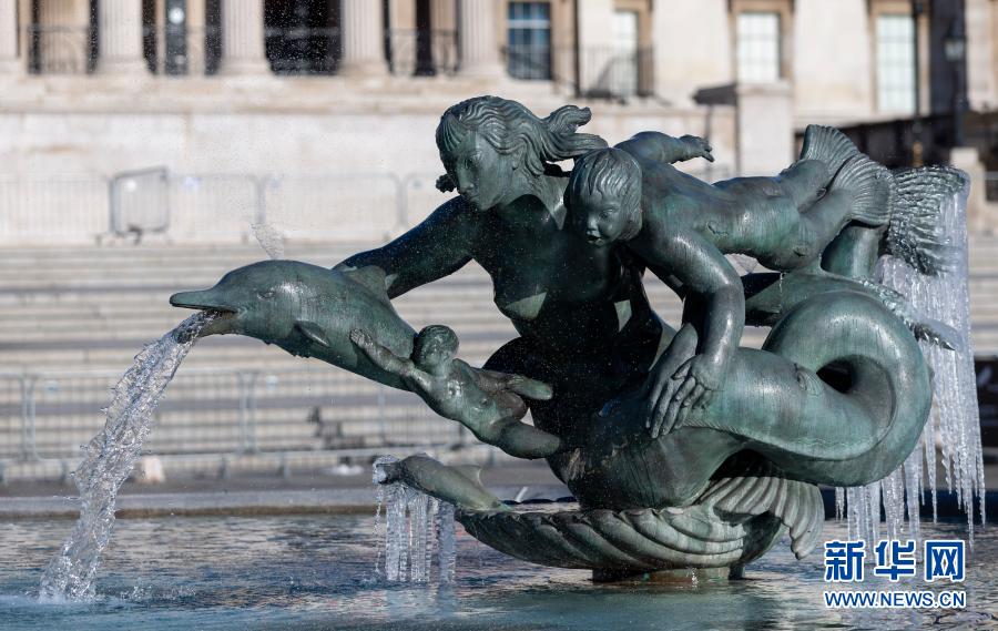 这是2月10日在英国伦敦特拉法加广场拍摄的被冰柱覆盖的雕塑。