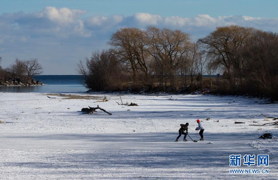 2月11日,在加拿大多伦多,人们在结冰的安大略湖面上打冰球。