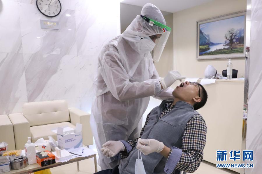 1月23日,医务人员在巴基斯坦萨希瓦尔燃煤电站内为一名准备进场的电站员工进行新冠病毒检测取样。新华社记者 李浩 摄