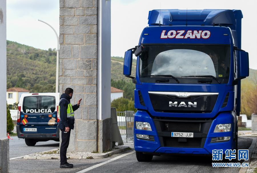 2月16日,在西班牙圣佩德罗和葡萄牙马尔旺边境处,工作人员在检查过往车辆。新华社发(古斯塔沃·巴连特摄)