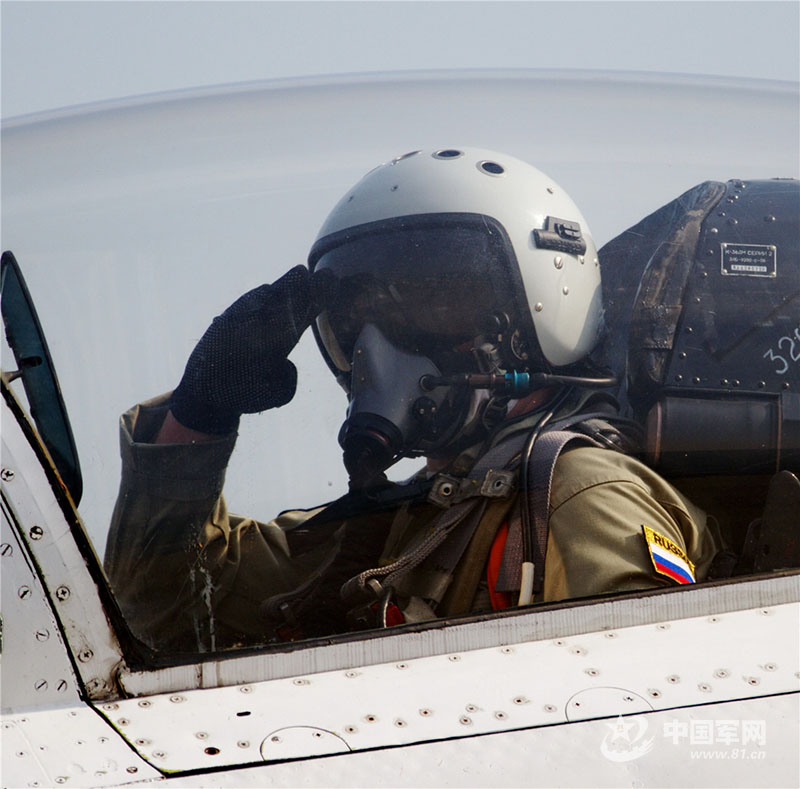 2012年11月14日,俄罗斯空军“勇士”飞行表演队参加第九届中国珠海航展飞行表演,在驾机滑向起飞线时,摄影师使用70-200mm变焦镜头+1.4倍增距镜拍到飞行员向观众致意行军礼的特写画面,拉近了飞行员与观众的亲切感。(周闽 摄)
