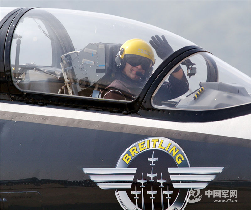 2012年11月14日,世界著名特技飞行表演队“百年灵”参加第九届中国珠海航展。在机队滑向起飞线途中,飞行员向观众挥手致意。摄影师使用70-200mm变焦镜头+1.4倍增距镜抓拍到座舱里飞行员面带微笑向观众打招呼和机身上表演队队徽“BREITLING”的特写,画面信息表达丰富。(周闽 摄)
