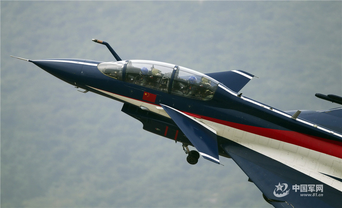 2014年11月,摄影师通过600mmm超远摄镜头,抓拍中国空军八一飞行表演队其中一架歼-10飞机前机身特写,机头、座舱、前起落架等细节清晰呈现,画面质感强烈。(周闽 摄)