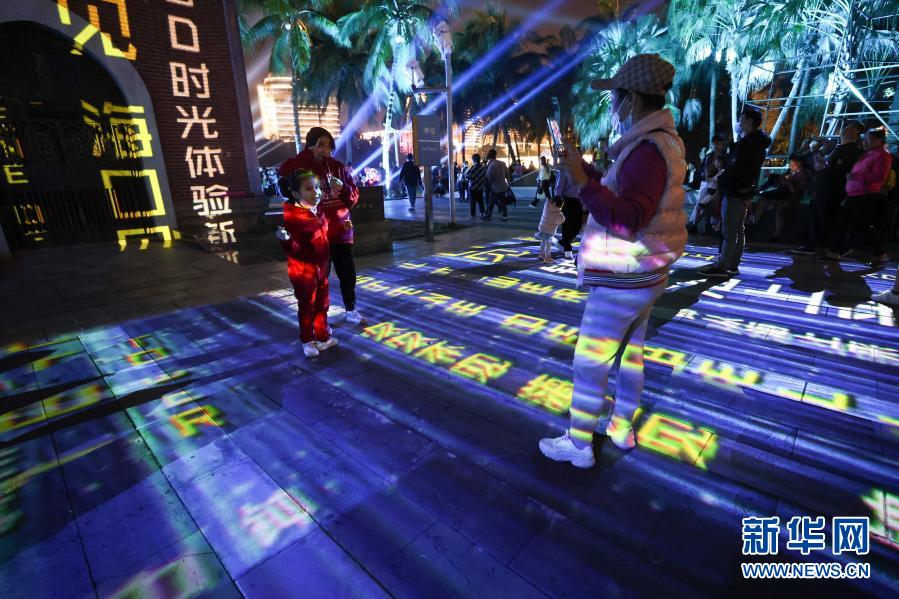 2月19日,市民在海口钟楼的光影秀前合影留念。新华社记者 张丽芸 摄