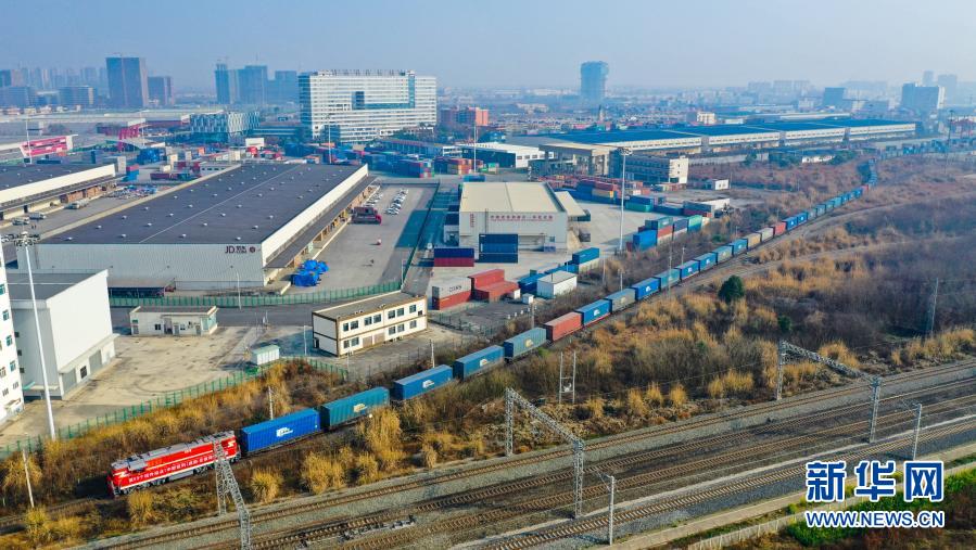 2月21日,成都至俄罗斯圣彼得堡的首趟中欧班列从成都国际铁路港驶出(无人机照片)。新华社发(成都国际铁路港管委会供图)