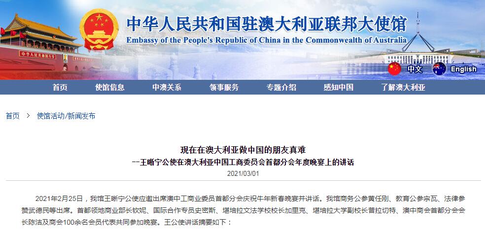 海外网3月2日电 据中国驻澳大利亚大使馆网站消息,2021年2月25日,我馆王晰宁公使应邀出席澳中工商业委员首都分会庆祝牛年新春晚宴并讲话。我馆商务公参黄任刚、教育公参宗瓦、法律参赞武德民等出席。首都领地商业部长钦妮、国际合作专员史密斯、堪培拉文法学校校长加里克、堪培拉大学副校长普拉切特、澳中商会首都分会会长陈洁及商会100余名会员代表共同参加晚宴。王公使讲话摘要如下: