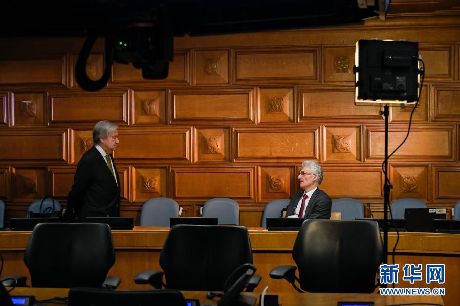 3月1日,联合国秘书长古特雷斯(左)与联合国负责人道主义事务的副秘书长洛科克在纽约联合国总部参加视频认捐会。