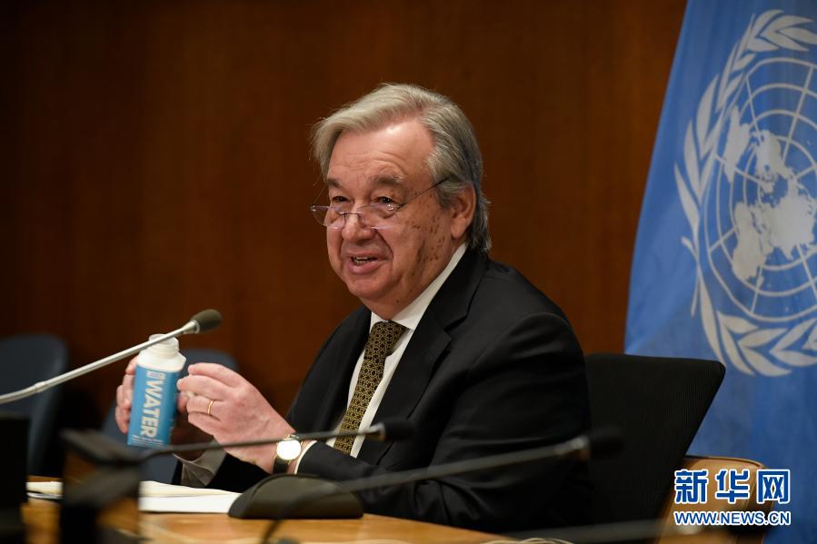 3月1日,联合国秘书长古特雷斯在纽约联合国总部参加视频认捐会。