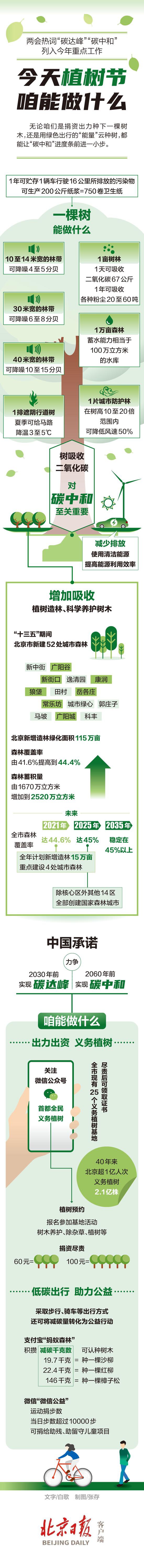 今年全国两会上,“做好碳达峰、碳中和工作”列入2021年重点任务,“十四五”规划也提出加快推动绿色低碳发展。3月12日是植树节,无论是捐资出力种下一棵树木,还是用绿色出行的“能量”云种树,都能让“碳中和”进度条前进一小步。