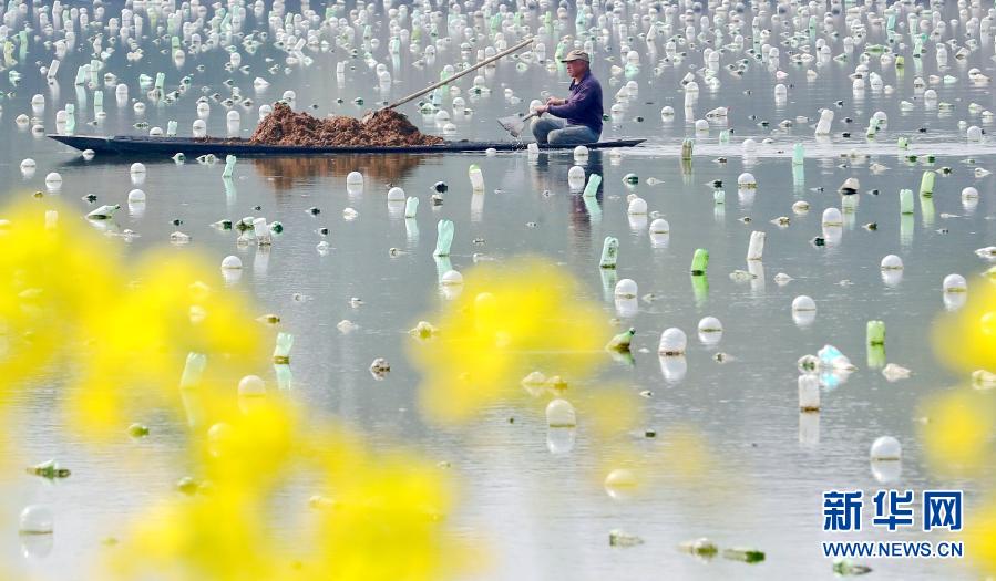 3月14日,在浙江省湖州市德清县新安镇下舍村,水产养殖户在珍珠蚌养殖基地水面上作业。新华社发(谢尚国 摄)