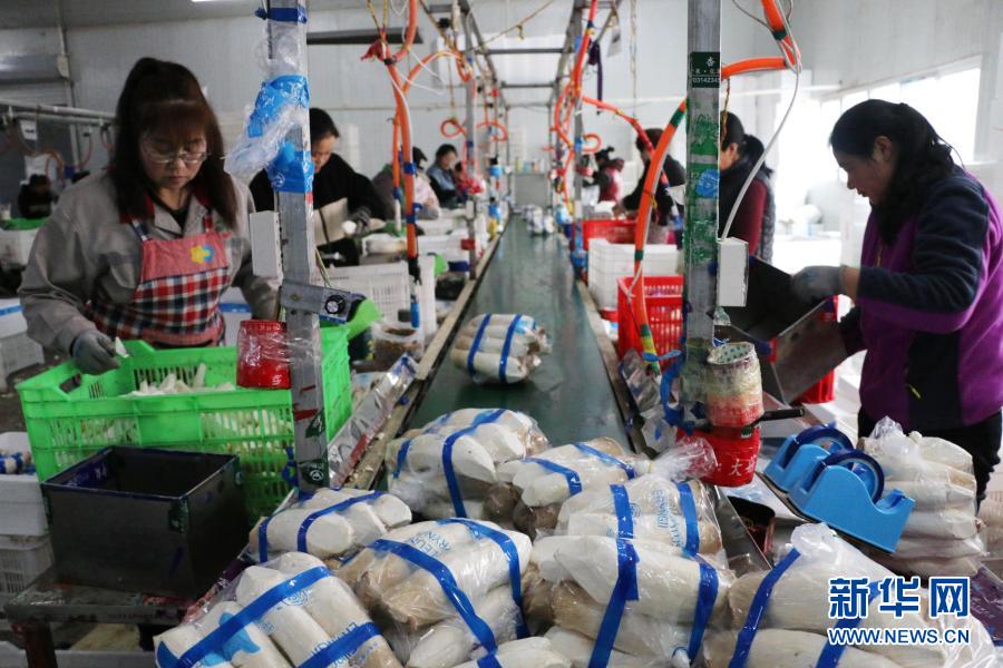 3月14日,工人在平泉市七沟镇一家食用菌生产企业包装杏鲍菇。新华社发(刘环宇 摄)