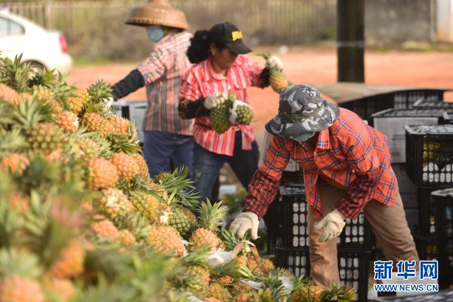 3月14日,海南省万宁市山根镇的农民在装运菠萝。新华社发(蒙钟德 摄)