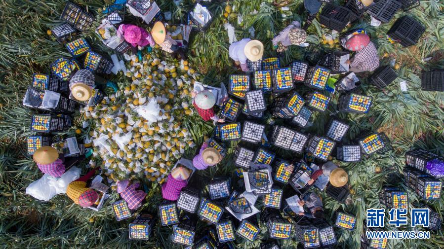 3月14日,海南省万宁市山根镇的农民在装运菠萝(无人机照片)。新华社发(蒙钟德 摄)