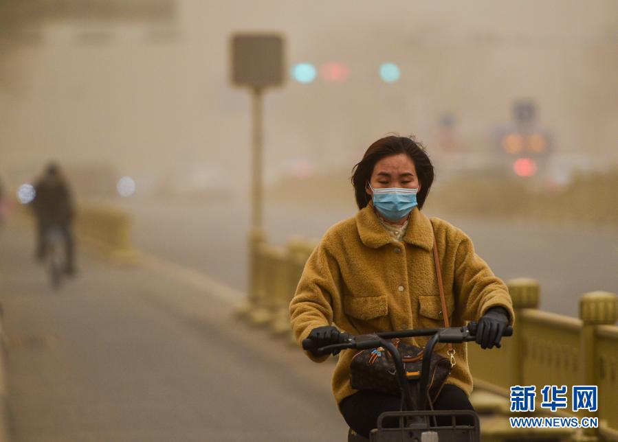 3月15日,行人在呼和浩特市中山东路上骑行。当日,呼和浩特市遭遇沙尘暴天气。新华社记者 连振 摄