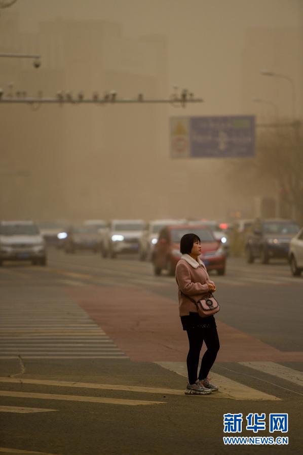 3月15日,行人在呼和浩特市街头等红绿灯。当日,呼和浩特市遭遇沙尘暴天气。新华社记者 连振 摄