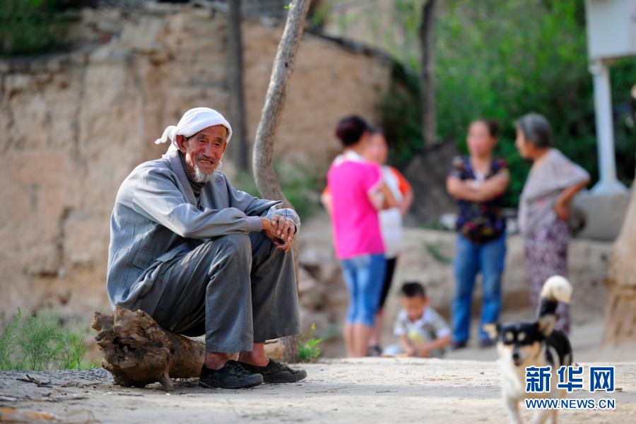 在方山县峪口镇石家峁村,刘庆吉在村口休息(2014年8月10日摄)。新华社发(刘亮亮 摄)