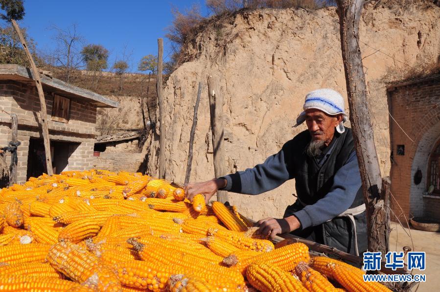 在方山县峪口镇石家峁村,刘庆吉在收拾玉米(2010年11月5日摄)。新华社发(刘亮亮 摄)