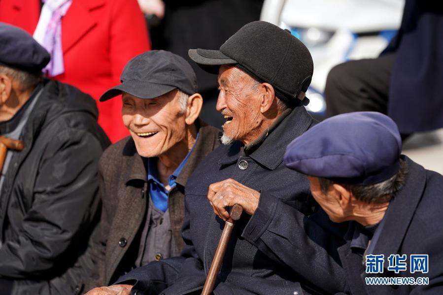 3月9日,在方山县峪口镇易地扶贫搬迁安置小区,刘庆吉(右二)观看村民的秧歌表演。新华社记者 詹彦 摄