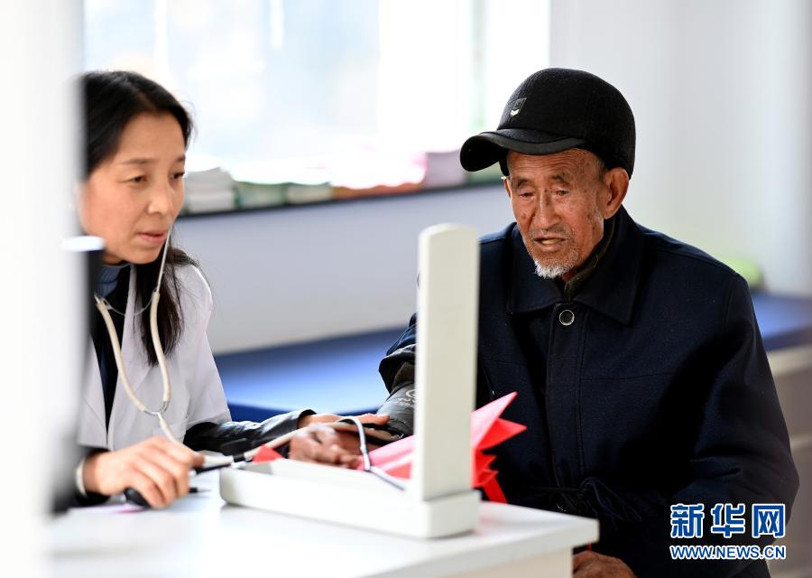 3月9日,在方山县峪口镇易地扶贫搬迁安置小区,刘庆吉在社区卫生服务站测量血压。新华社发(刘亮亮 摄)
