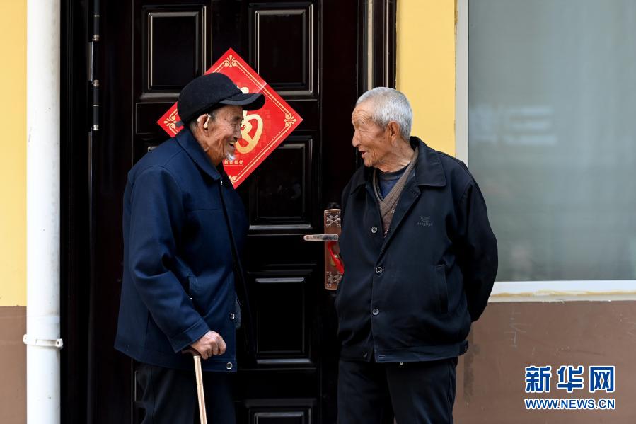 3月9日,在方山县峪口镇易地扶贫搬迁安置小区,刘庆吉(左)在和村民聊天。新华社记者 詹彦 摄