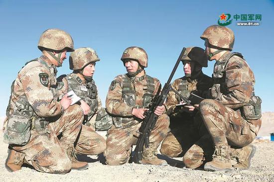 陈明在训练场给战友们讲解狙击技巧。程烨 摄