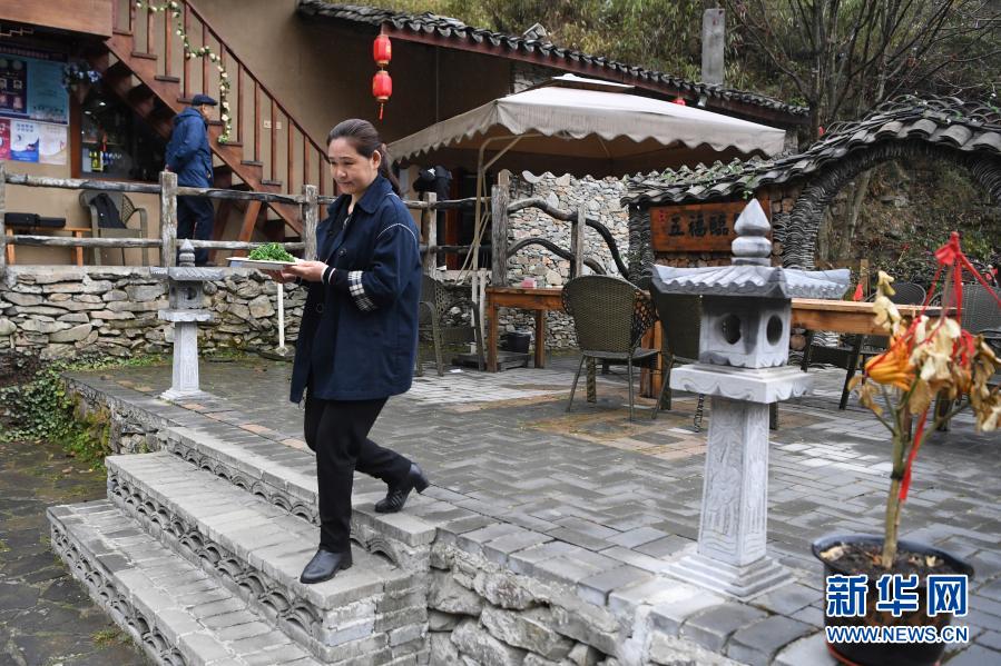 3月17日,在陇南市康县岸门口镇朱家沟村,“五福临门”民宿的主人曹艳准备给客人上菜。新华社记者 陈斌 摄