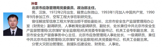 首都之窗3月24日更新信息显示,孙雷任北京市应急管理局党委委员、政治部主任。