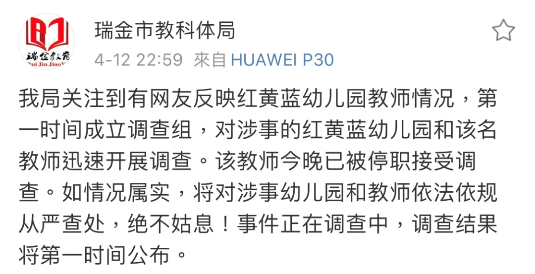 12日晚,瑞金市教科体局发布通报:瑞金市教科体局第一时间成立调查组,对涉事的红黄蓝幼儿园和该名教师展开调查,当晚,该教师已被停职接受调查。如情况属实,将对涉事幼儿园和教师依法依规从严查处,绝不姑息。