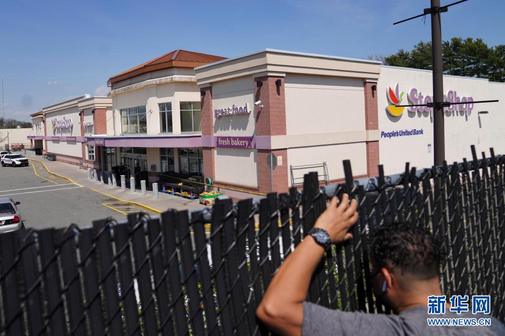 4月20日,在美国纽约州长岛地区西亨普斯特德,一名男子透过栅栏张望发生枪击事件的连锁超市。