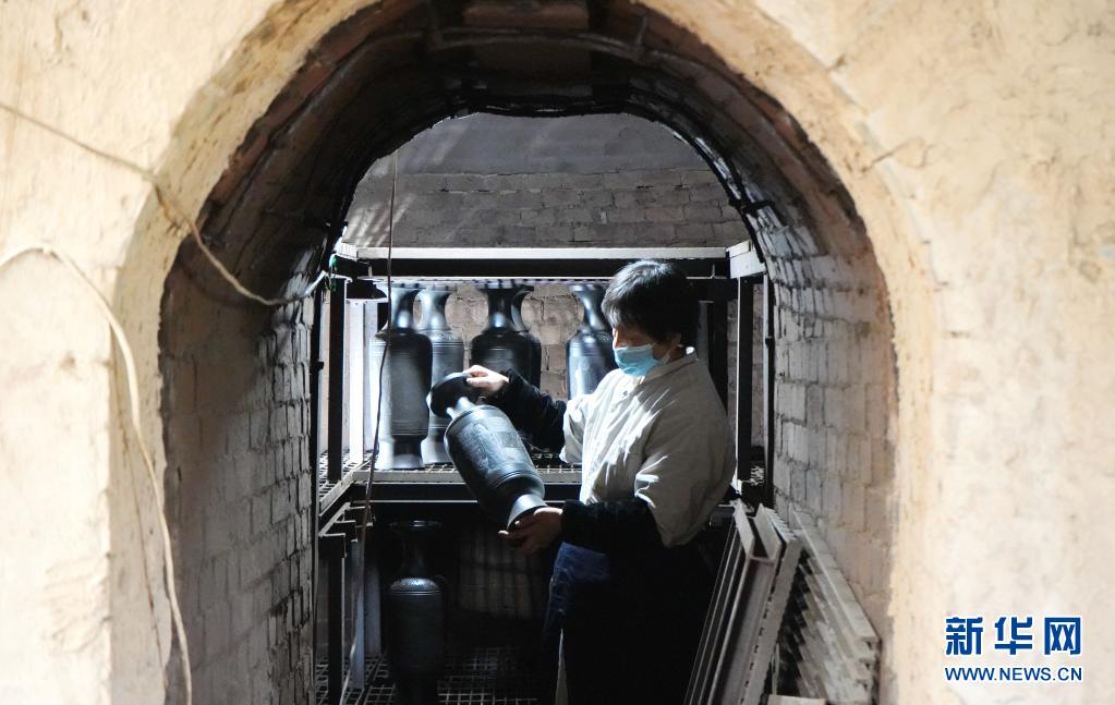 4月20日,在馆陶县陶艺漆艺研究所,一名工人检查出窑的黑陶。