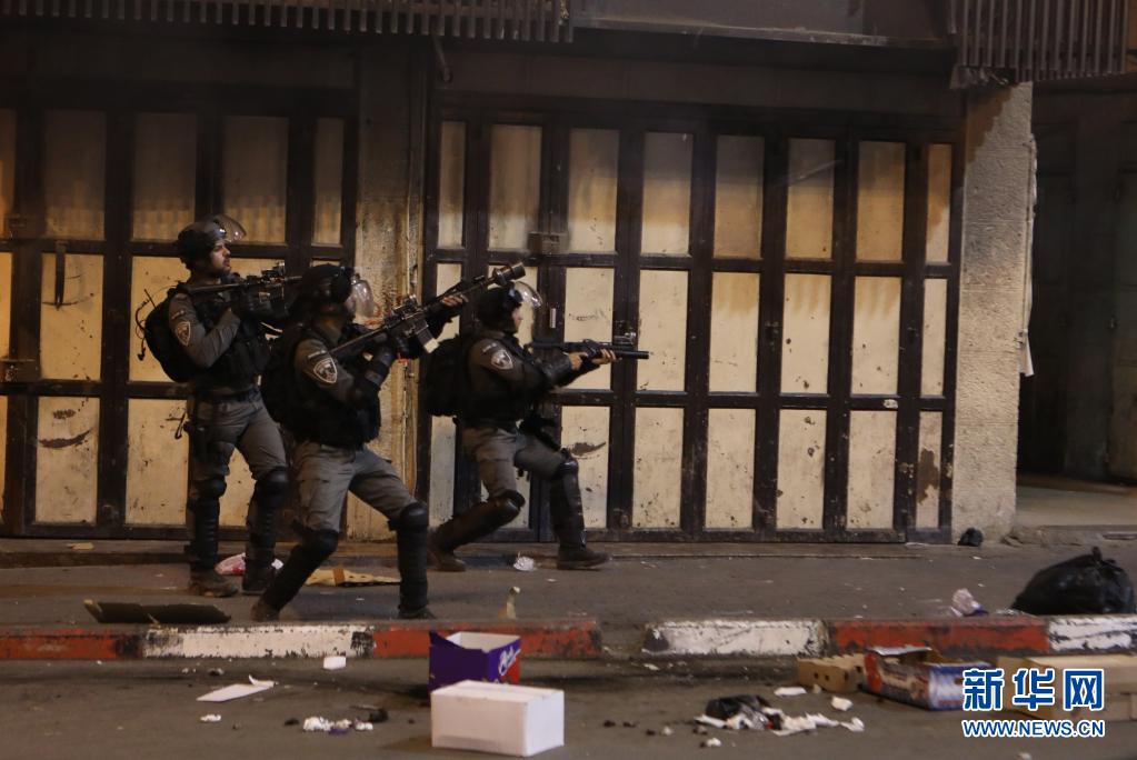 4月24日,以色列士兵在约旦河西岸城市希伯伦的抗议活动中手持武器警戒。