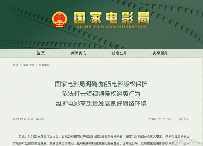 国家电影局28日通报,针对当前比较突出的“XX分钟看电影”等短视频侵权盗版问题,国家电影局配合国家版权局继续加大对短视频侵犯电影版权行为的打击力度,坚决整治短视频平台及自媒体、公众账号生产运营者未经授权复制、剪辑、传播他人电影作品的侵权行为,积极保护广大电影版权权利人的合法权益。(记者白瀛、王鹏)