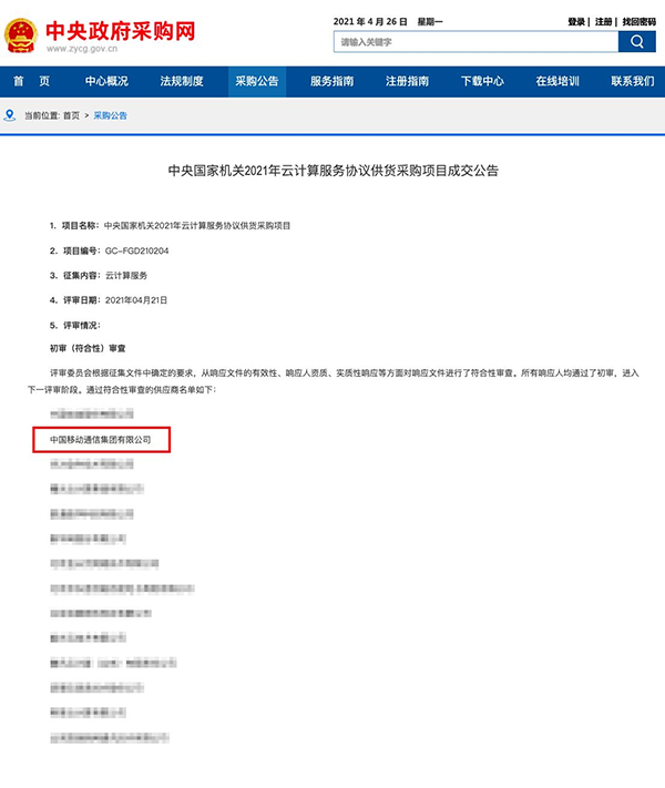 2021年4月25日成交公告发布,移动云成功中标,成为参与响应的供应商之一。本次评审共计1811款产品入围。