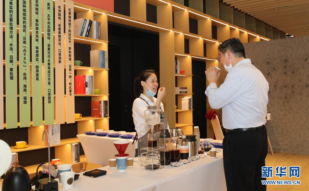 4月29日,工作人员在咖啡市集活动中向来宾介绍咖啡的口味。