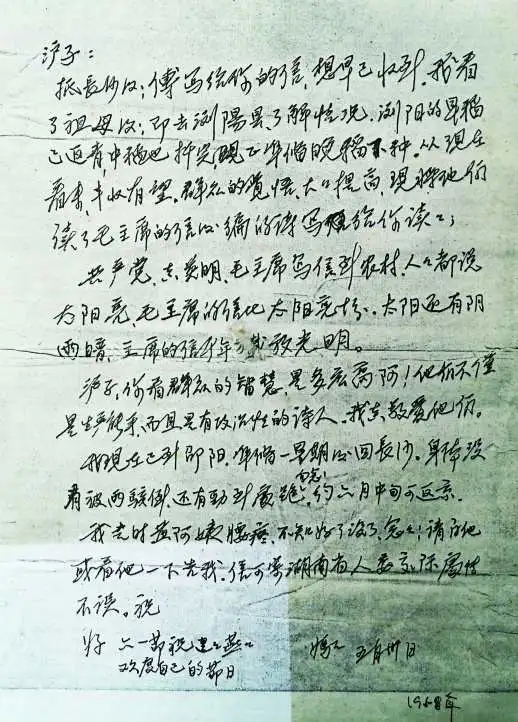 我已于四月廿四日回京。农村和工厂,热潮很高,干部和群众,干劲是过去我们所想不到的,他们中间,有很多人的智慧现在都大大发挥出来了。我这次在农村在工厂,都看到他们造的万能拖拉机,改良后的双铧犁、抽水机、颗粒肥料等等,总之说不完。你每天可在报纸上多注意看些,真是毛主席所说的,人民的智慧是无穷的力量。