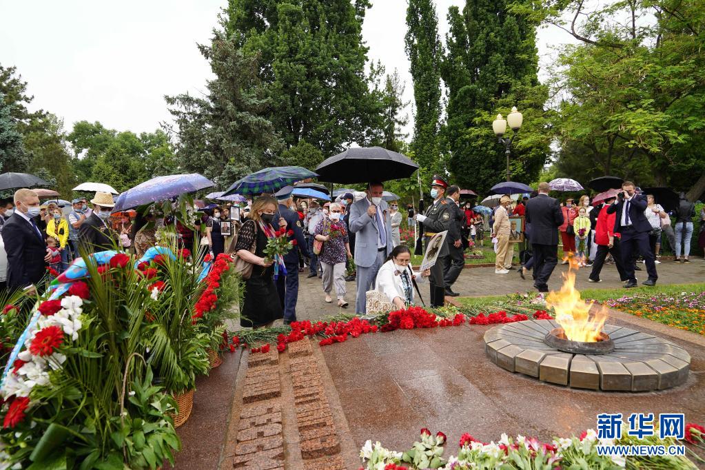 5月9日,在乌兹别克斯坦首都塔什干,人们冒雨向二战中牺牲的烈士献花。