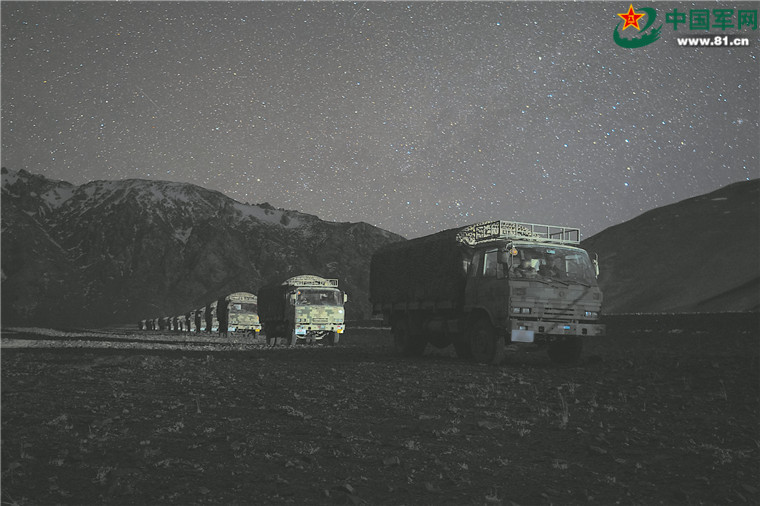 夜训中的行军车队。中国军网记者 陈 磊 摄