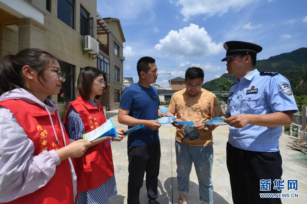 5月10日,在浙江省杭州市临安区龙岗镇汤家湾村,反诈志愿者服务队成员给村民宣讲如何防范新型电信诈骗。