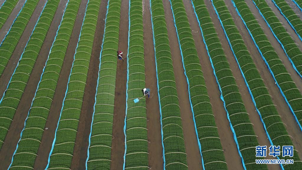 5月11日,唐山市滦南县泽恩水稻种植专业合作社农民在施肥后冲洗水稻秧苗(无人机照片)。