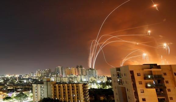 以军“铁穹”系统5月12日在南部城市阿什凯隆拦截火箭弹。(路透社)