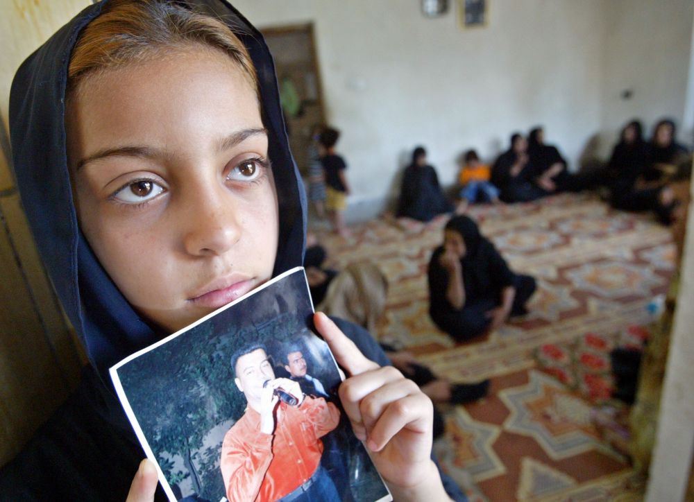 2004年5月25日,在伊拉克首都巴格达,一名女孩手持父亲的照片参加悼念仪式。她父亲在美军袭击中身亡。(新华社发)