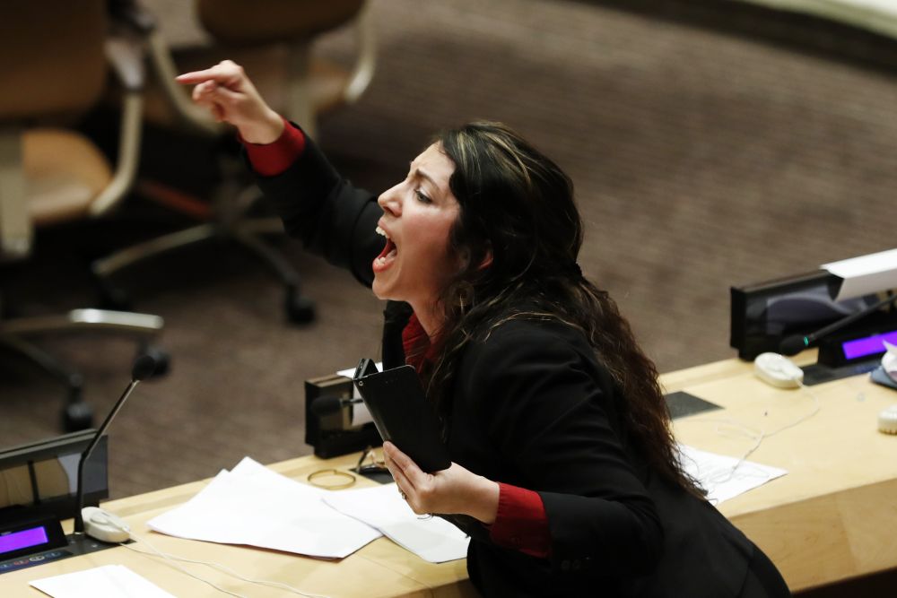 2018年10月16日,一名古巴代表在位于纽约的联合国总部举行的会议上呼喊口号。(新华社记者李木子摄)
