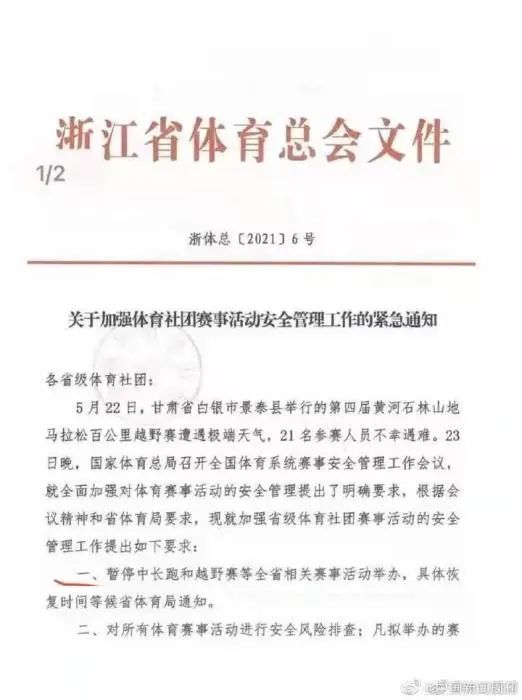 值得一提的是,24日晚,2021银川马拉松赛组委会发布公告称,为确保参赛选手身体健康和生命安全,决定启动大型赛事熔断机制,延期原定于5月30日举办的赛事。同日,浙江省体育总会也紧急发布了《关于加强体育社团赛事活动安全管理工作的紧急通知》,暂停中长跑和越野赛有关赛事活动举办,具体恢复时间等候省体育局通知。