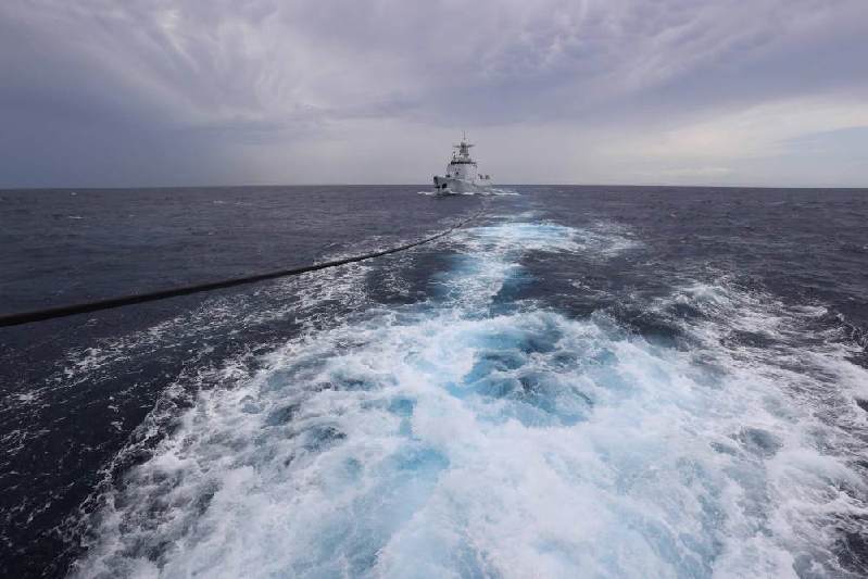此时,编队突遇局部强对流天气,海上风浪逐渐增大,大雨弥漫至整个补给海区。编队指挥所科学研判,适时发布指令,合理调整补给航向,高邮湖舰找准时机,迅速放出纵向液货输送管路。
