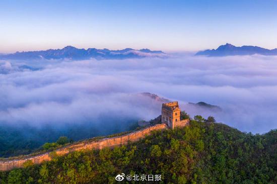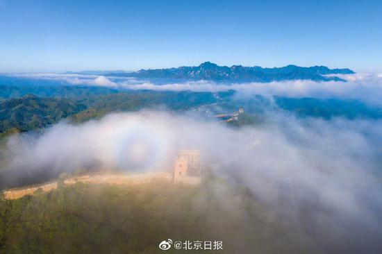 6月1日清晨,历经了一夜的雨,北京密云区古北口蟠龙山长城惊现“云海佛光”奇观。连绵的云海掩映着蟠龙山长城,并骤然幻化出一个红、橙、黄、绿、青、蓝、紫的七色光环,中央虚明如镜,实为难得一见的美景。