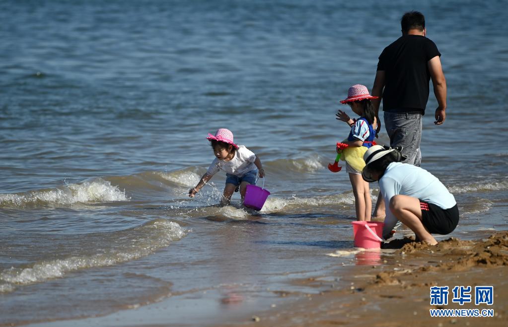 在天津市滨海新区东疆港人工沙滩,小朋友在家长的陪伴下“赶海拾贝”(6月5日摄)。新华社记者 李然 摄