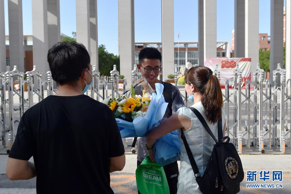 6月8日,在宁夏银川市第二中学考点,家人为考生送上鲜花。当日,全国部分地区2021年高考结束。新华社记者 唐如峰 摄