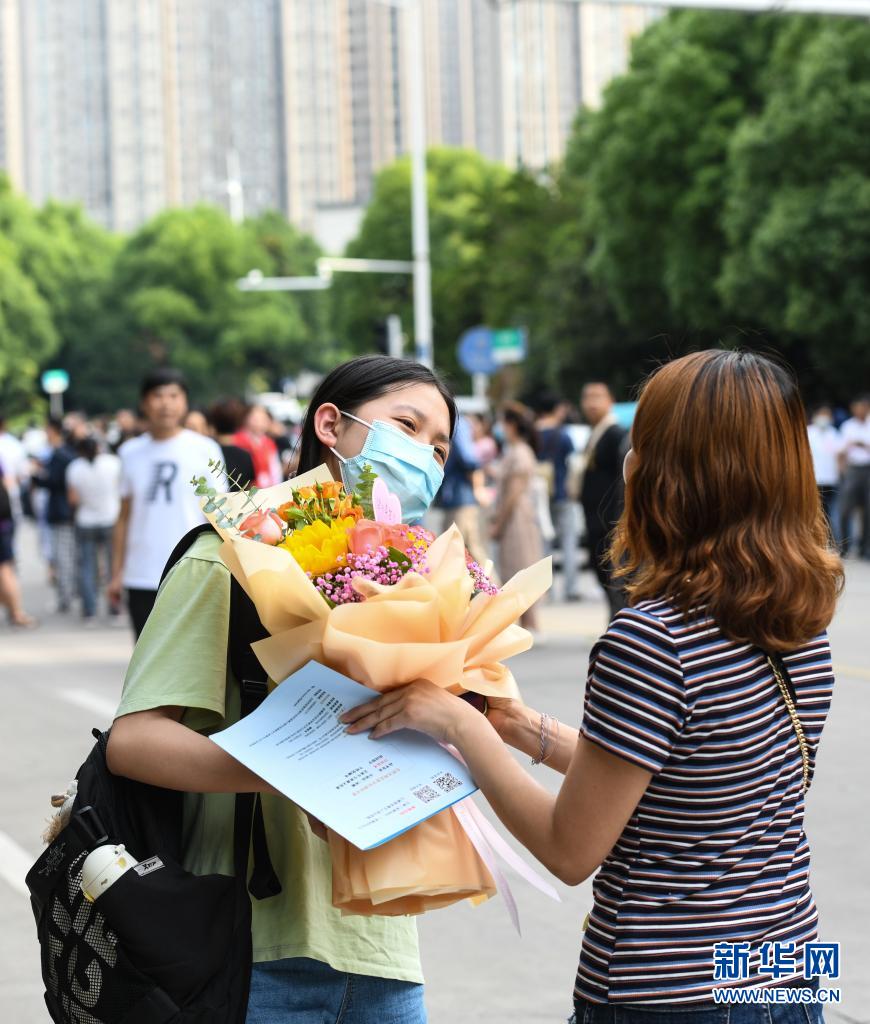 6月8日,在安徽省合肥市第八中学考点,家长向考生送花。当日,全国部分地区2021年高考结束。新华社记者 韩旭 摄