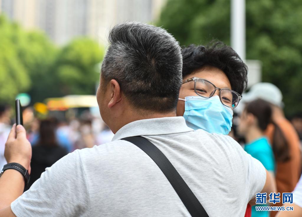 6月8日,在安徽省合肥市第八中学考点,一名考生结束考试后和父亲拥抱。当日,全国部分地区2021年高考结束。新华社记者 韩旭 摄