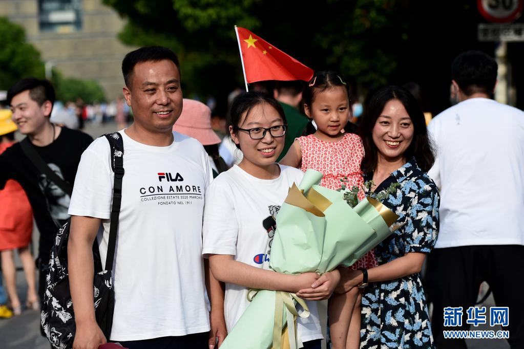6月8日,考生和家人在安徽省合肥市五十中学天鹅湖校区考点外留影。当日,全国部分地区2021年高考结束。新华社记者 黄博涵 摄